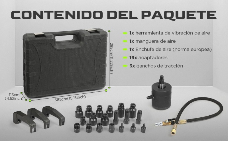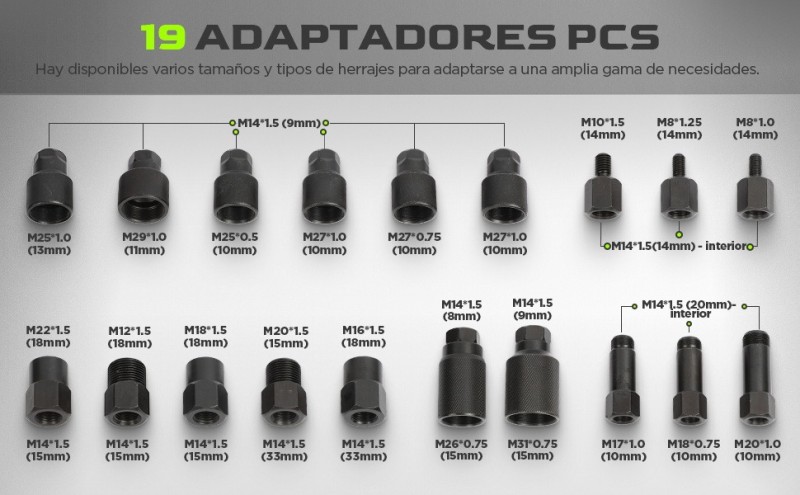 - 3 ganchos de tracción y 19 tamaños de adaptador diferentes: El extractor neumático de inyectores diesel incluye 3 ganchos de tracción diseñados para extraer el inyector a profundidades relativamente grandes. El extractor de inyectores diesel viene con varios adaptadores, incluyendo M20*1.0, M18*0.75, M17*1.0; M8*1.25, M8*1.0, M8*1.5; M14*1.5, M16*1.5, M18*1.5, M20*1.5, M22*1.5; M25*0.5, M25*1.0; M26*0.75 M25*0,5, M25*1,0; M26*0,75; M29*1,0, M31*0,75; M27*0,75, M27*1,0