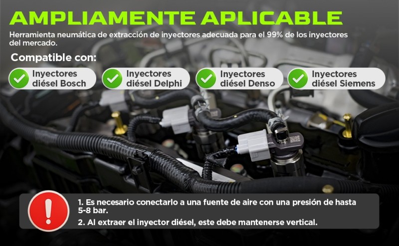 - Kit de Extractor Neumático de Inyectores: El extractor de inyectores diesel sólo necesita conectar la fuente de aire (máximo 5-8 bar) a la herramienta para conectar la boquilla del inyector, y luego utilizar la presión de aire para conducirlo, puede rápida y fácilmente sacar la boquilla del inyector diesel obstinada, oxidada o atascada, lo que reduce eficazmente el tiempo y la energía de extracción manual.